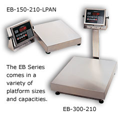 Simplicity of design and rugged construction are the key features of the EB-210 Series which come in a variety of capacities and platform sizes listed below. At home around food and water, the simple frame and bridge design with lift-off platform simplifies cleanup by providing direct access to all of the components. The LED display of the 210 indicator is perfect for indoor use and it combines all of the features of the 204 and 205 indicators, plus it has a numeric keypad, piece count, and over/under checkweighing. The NEMA 4X/IP66 stainless steel enclosure of the 210 indicator makes this scale useful in washdown situations. Push button tare, auto shutoff, AC or battery power, large LCD display, flexible print formats, pounds/kilograms conversion, RS232 output, and stainless steel construction make this powerful bench scale ready for top performance and long-term accuracy.