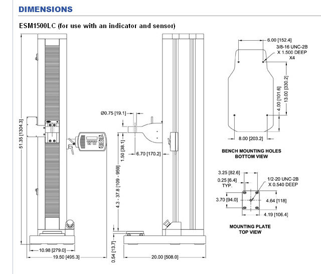 ESM1500 and ESM750 single-column force testers are highly configurable solutions for tension and compression measurement applications, with capacities of 1,500 lbF (6.7 kN) and 750 lbF (3.4 kN), respectively. With generous travel and clearance, they are suitable for break testing, cycling, limit testing to a load or distance, loadholding, elongation testing, tensile testing, compression testing, and more. Satisfy various test methods through an intuitive menu with selectable test parameters, such as speed, number of cycles, etc. Up to 50 profiles may be saved and password protected. Crosshead positioning for sample setup is a breeze with available FollowMe®. Using your hand as your guide, push and pull on the load to move the crosshead at a dynamically variable speed. The stands feature a unique modular controller function platform. Functions such as travel measurement, cycling, etc. are offered individually, accommodating a wide range of budgets and applications. Collect force and travel data, plot and analyze results, and control test stand motion via MESUR®gauge Plus software. Or, fully control the stand by a PC through a custom application. FollowMe TM dynamic positioning Using your hand as your guide, push and pull on the load cell or force gauge to move the crosshead. Re-sponsive enough for quick positioning as well as fine adjustments Simple controller interface Rugged aluminum up/down/stop keys are designed for industrial environments. Zero Travel and FollowMe TM keys add convenience. Removable for remote use. See the following page for a full list of available functions. Limit switches Adjustable upper and lower solid state limit switches stop test stand travel with 0.001 in. [0.025 mm] repeatability. Modular design Most electronics are housed in an integrated enclosure,easily accessible and remov-able for updating and service. Indicators Choose from three indicator models. Consider a Model 7i or 5i to take full advantage of all test stand functions. Series R01 force sensors (load cells) Rugged S-beam design. Avail- able in capacities from 50 to 2,000 lbF [250 N to 10 kN]. Series R03 force sensors (load cells) Enclosed design. Available in capacities from 0.25 to 100 lbF [1 to 500 N] Force gauges Choose from several gauge series. Consider a Series 7 or 5 gauge to take advantage of all test stand functions. Optional mounting plate, threaded hole matrix A matrix of #10-32 threaded holes is provided, along with a 5/16-18 center hole Optional mounting plate, m ultiple hole thread sizes Three thread sizes are provided [#10-32, 5/16-18, and 1/2-20], along with an array of four 1/4-28 holes MESUR TM gauge data collection software Output force vs. time or force vs. distance data from the ESM1500’s USB port. MESUR TM gauge graphs,tabulates, calculates statistics, and provides report-ing and output tools Optional Functions Any of the below functions may be purchased at time of order or may be activated in the field at a later date via an activation code. A complete options package is also available at a discounted price. The stand is supplied in Demo Mode, a 160-hour time period in which all functions are temporarily enabled