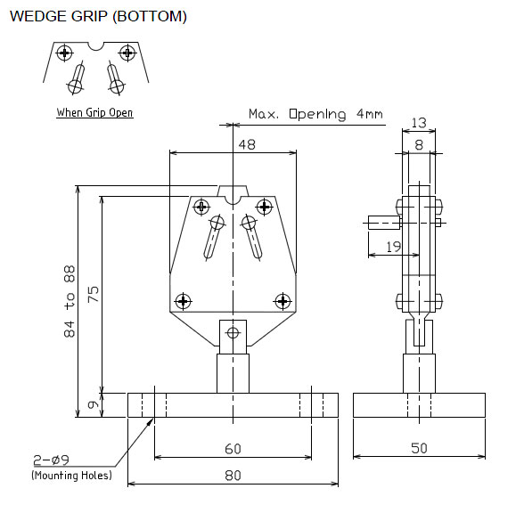 SHIMPO’s Wedge Grip attachments are ideal for testing wires, strip material, and plastic tape or films. The Wedge Grip comes in two capacities for lighter and heavier loads; spring-loaded jaws automatically close on the specimen and tighten as tension is applied.