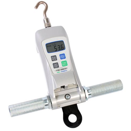 The Shimpo FGE-500HXY Capacity Digital Force Gauge measures both push and pull forces up to 500 lbs / 250 kg. Two knurled steel handles are provided for hand operation and a hanger is included which enables each gauge to be used as a scale.
