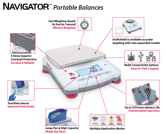 OverviewRugged, Multi-Purpose Balances for a Wide Range of General Weighing Applications OHAUS raises the bar in price-performance ratio with the newly-designed Navigator series which is perfect for general weighing applications in laboratory, industrial and education settings. Ruggedly constructed and multifunctional,