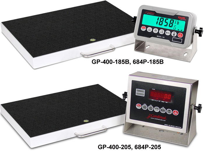Cardinal Scale’s NTEP legal-for-trade certified 684P-205 GP-400/684P scales are lightweight and portable with almost limitless uses. Featuring a roomy 18 x 14-inch steel platform with bakedon, long-lasting powder-coat paint, and nonskid rubber mat with bubble level, these scales are portable with a built-in carrying handle They offer keypad tare, auto power off, digital speed and accuracy, vivid readouts, and the indicator may be set on a table or floor or even mounted on the wall for readouts.